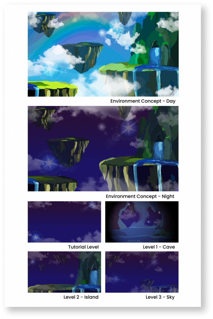 Developed background art design for each level of the 2D Puzzle-Platformer Adventure game “HULI” (published) | Adobe Illustrator & Photoshop
